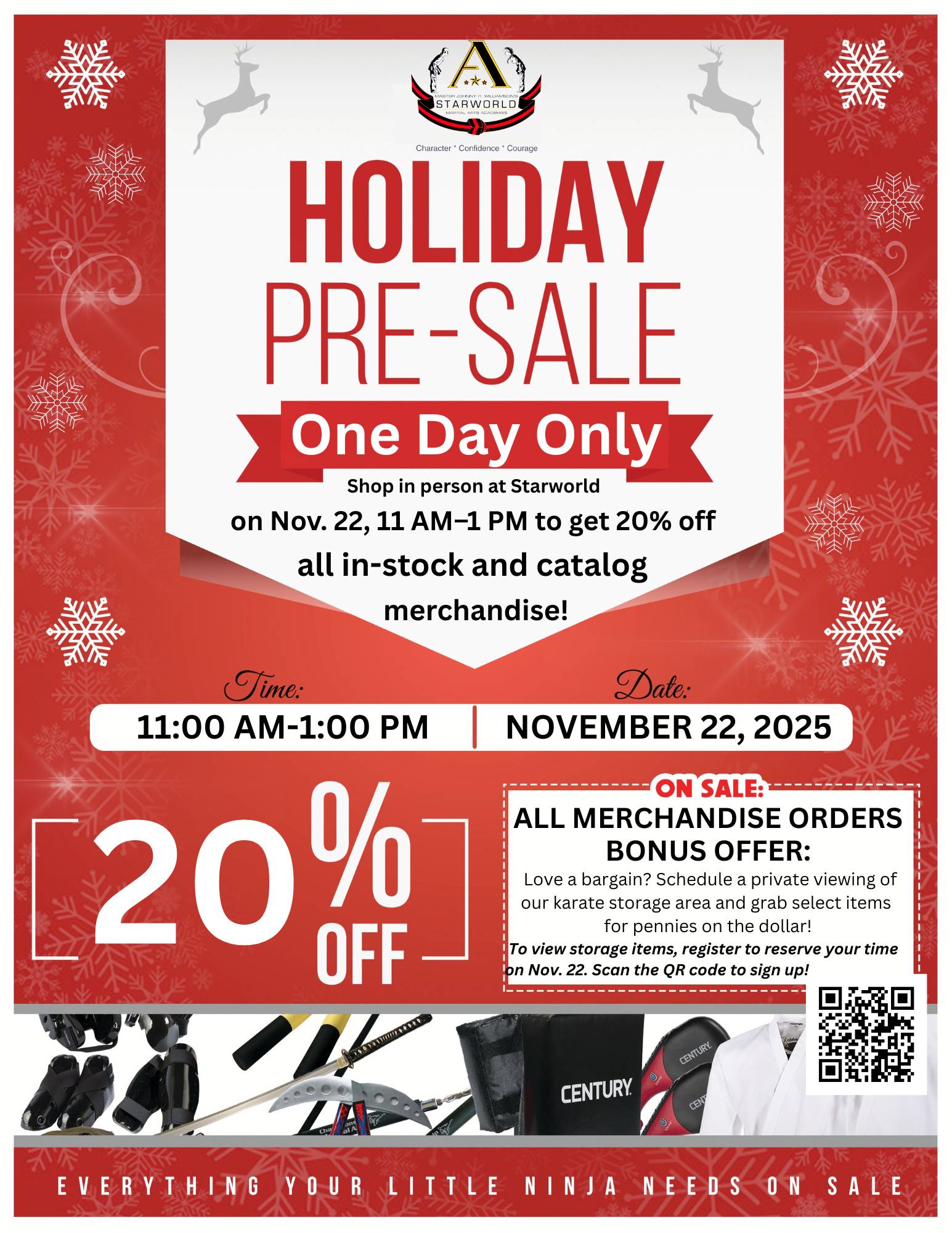 Happy Wednesday! I hope your week is rolling along strong. We wanted to reach out with some good news, important updates, and a big thank-you for everything our Starworld families are doing to keep our community thriving. 1. A Huge Thank You to Our ParentsParent Appreciation Week has been outstanding — your energy lit up the school. As a token of our gratitude, parents can train FREE for the rest of the year: https://form.jotform.com/251908993551064 Whether you want to jump on the mat next to your child in the Family Class or train with other adults in our Adult Self-Defense Program, we’d love to have you involved. You’re part of this team just as much as your kids. 2. This Saturday: Merchandise Pre-SaleWe’re holding a special merchandise holiday, aka Black Saturday pre-sale, this Saturday — and yes, this includes items from our storage area. Expect great finds on: