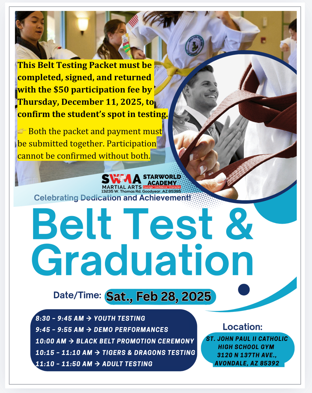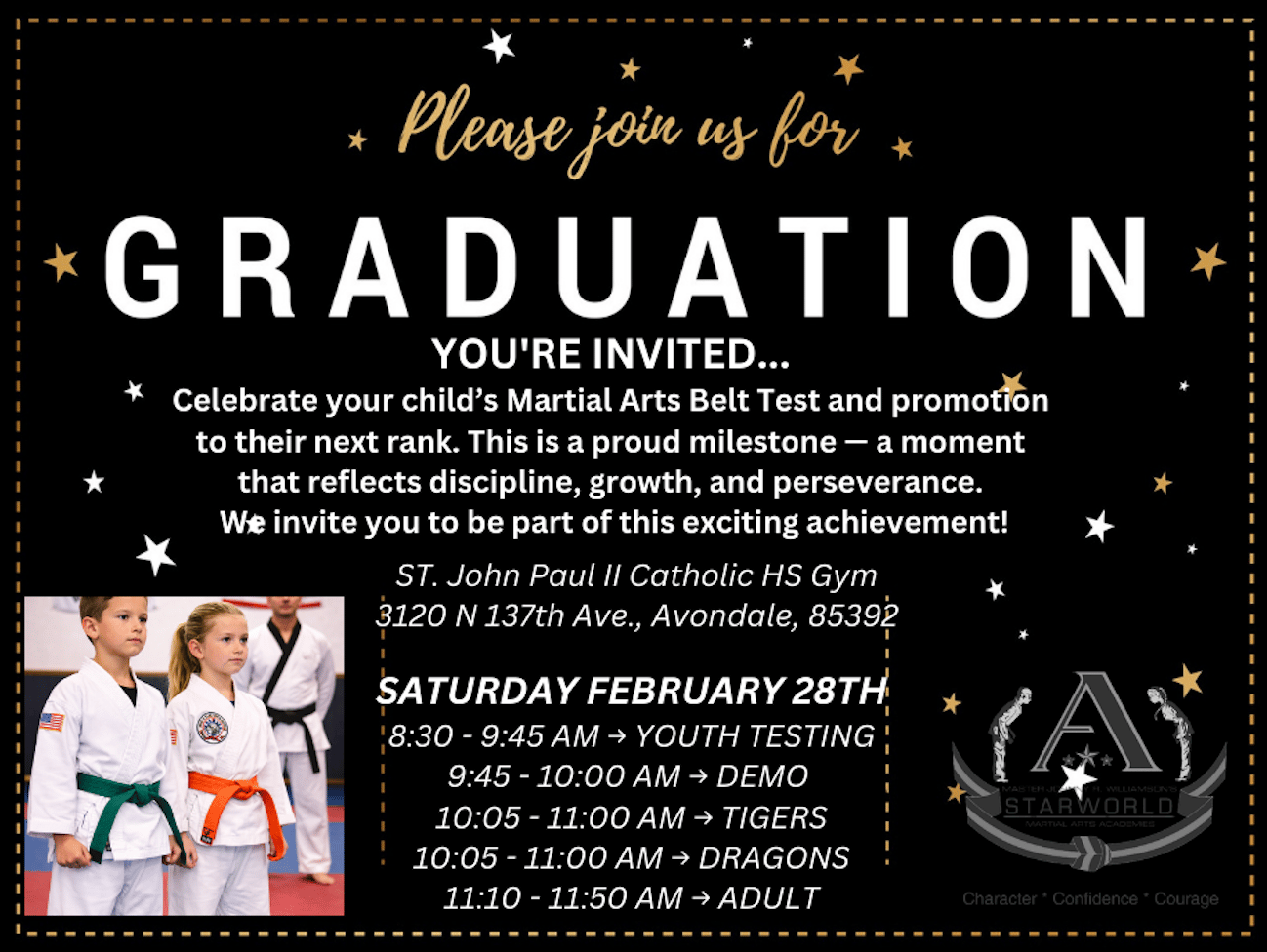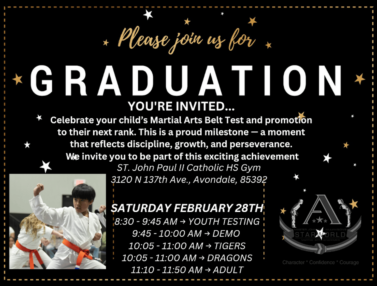 Dear Reader and family, Belt Test Day is almost here, and we are preparing for a strong, organized, championship-level event. Saturday, February 28, 2026 Schedule Please arrive 15 minutes early so students can check in, line up properly, and begin focused and ready. Why Belt Testing MattersBelt testing is more than a promotion. It is a structured milestone that teaches preparation, accountability, courage under pressure, and follow-through. When a child tests, they are learning to set a goal, train consistently, and stand up to be evaluated. That process builds real confidence, the kind that is earned. We know every parent wants their child to behave well, put effort in, and grow into their best self. When challenges arise at home or school, it can feel natural to remove privileges. What we have consistently seen over the years is this: Karate is not simply a reward. The more consistently a child attends, the more they receive not just physical training but also character reinforcement. In class, students participate in our Mat Chats, where we talk directly about respect, self-control, discipline, perseverance, and being their best. At home, they complete Good Job Sheets, Coloring Sheets, and Character Worksheets that reinforce those lessons. Consistency matters. Research continues to support the positive impact of martial arts on youth development. Publications such as Parents have highlighted martial arts for building focus and confidence in children, while Psychology Today has discussed its role in strengthening resilience, emotional regulation, and self-control, qualities that contribute to long-term success. If you ever feel your child needs extra support, please request a Parent-Teacher Conference. We welcome those conversations. When challenges appear, that is when partnership matters most. We are on your side, and we will be there for you. Our children are our future. Their development is too important to leave to chance. We are honored to play a role in helping shape their discipline, confidence, and character. Important Reminders for Test Day• Full clean white uniform Demo Team Bake SaleOur Demo Team will host a Bake Sale during Belt Testing to support upcoming training and competition events. Please stop by their table before or after your student tests. It’s a great way to support our student leaders. Cash is appreciated. We are looking forward to a powerful and positive testing day. Thank you for trusting us with your child’s growth. Tang Soo! |