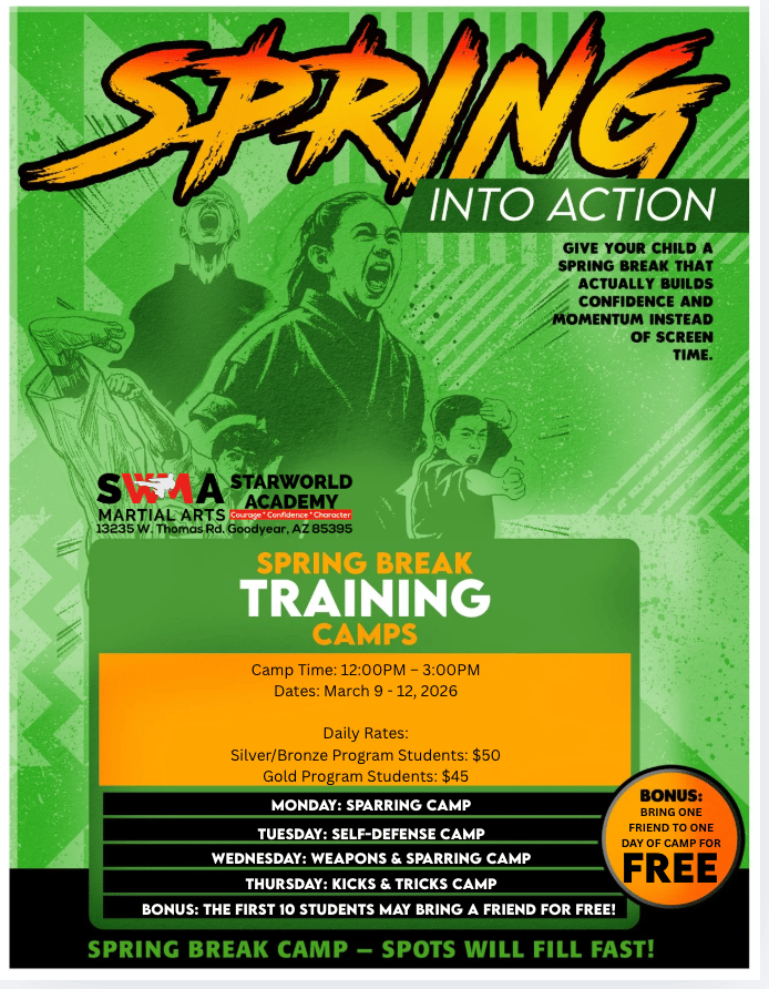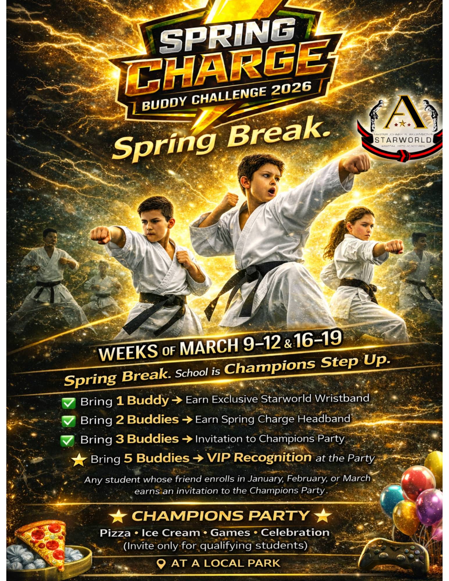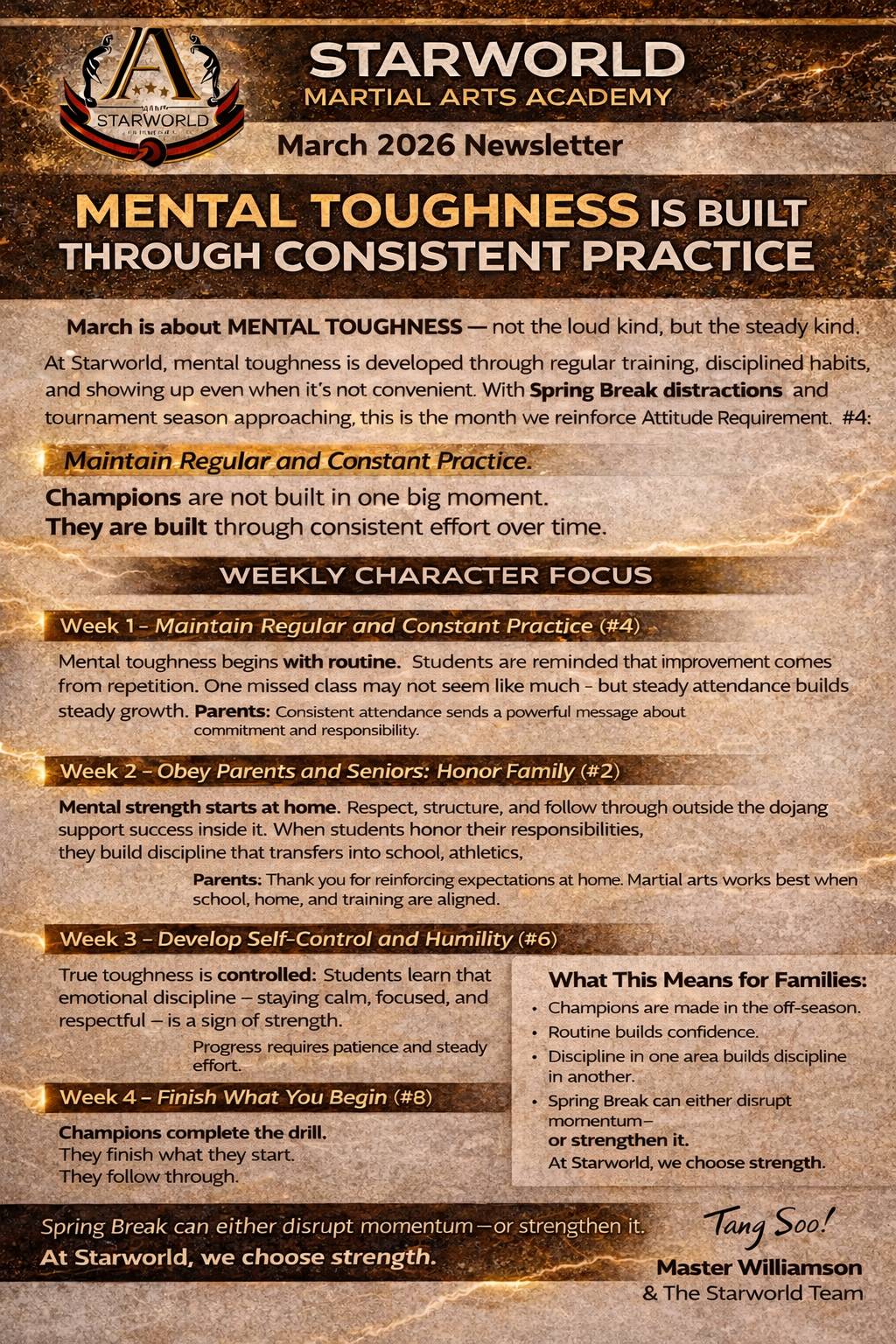Hello Reader and family, March is here, and this is an important month at Starworld Martial Arts Academy. February was about preparation. Not the loud kind, the steady kind. We know Spring Break can interrupt routines. We know schedules shift. That’s exactly why this month matters. Consistency builds confidence, and that confidence carries over to school, sports, and life. We appreciate your commitment to keeping your loved ones in training. It makes a difference, and we see it. Here’s what’s ahead: 🥋 Spring Break Training Camps – March 9–12 Spring Break doesn’t have to mean lost momentum. It can be a chance to sharpen skills and build confidence. Camp runs from March 9–12, 12:00–3:00 PM. Each day has a focused theme: • Monday – Sparring Camp Smaller groups. More individual attention. Strong, focused training. If your child needs structure during break, this is a great option. 👉 Register for Spring Break Training Here: 🏆 Spring Training Upgrade & Equipment Sale – Week of March 9 Tournament season is approaching, and preparation builds confidence. This week: • Silver → Gold Upgrade Special (train 3x per week + Saturday mat time) Whether your child competes or not, being properly prepared helps them feel ready and capable. Ask at the front desk if you have questions — we’re happy to guide you. 👥 Spring Buddy Challenge – Weeks of March 9–12 & 16–19 One of our favorite traditions. There is something powerful about students sharing what they love. When they bring a friend, they step into leadership. Students may: • Bring 1 Buddy – Earn an exclusive Starworld wristband This is about confidence and connection. We’ll celebrate participation and keep it positive and fun. Start thinking about who your child might enjoy training with. 🏅 Friendship Tournament – Growth Through Competition Competition builds courage — but more importantly, it builds composure. Stepping onto the floor teaches students how to manage nerves, focus under pressure, and represent themselves with confidence. Whether your child is new to tournaments or experienced, growth is the goal. 👉 Register for the Friendship Tournament Here: Demo Team Car Wash Fundraiser Our Demo Team members will be washing cars to raise funds for upcoming performances and events. We would truly appreciate your support. Bring your car to the karate studio on Saturday, March 28, between 9:00 AM and 12:00 PM, and let our team make it shine. Every wash helps these young leaders continue representing Starworld with pride. Thank you for supporting their hard work and dedication. March Focus: Maintain Regular and Constant Practice (#4) Champions are not built in one big moment. Showing up consistently builds: • Discipline Spring Break can either slow momentum or strengthen it. At Starworld, we choose to strengthen it. We are proud of our students. We see their effort. We see their growth. Thank you for partnering with us in their development. Let’s make March count. Tang Soo! Master Williamson |