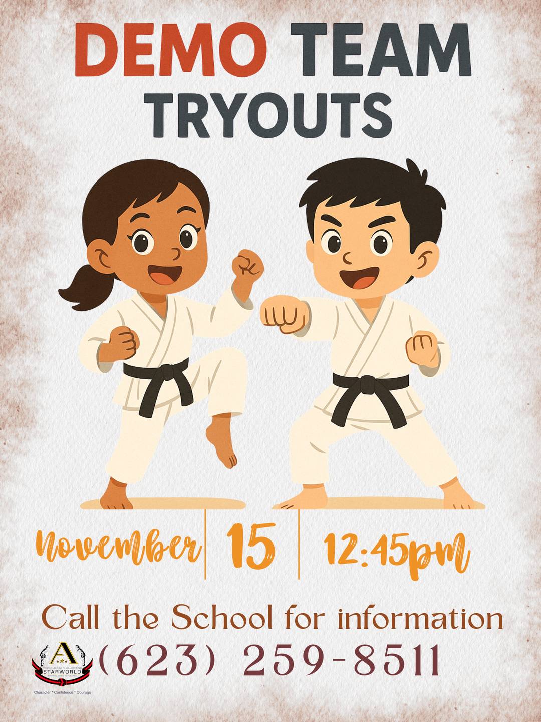 Dear Starworld Families, November is a special month filled with leadership, gratitude, and opportunity at Starworld Martial Arts Academy. Please review the important announcements below. Demo Team TryoutsDo you enjoy exciting, high-energy martial arts? Our Elite Performance Demo Team is holding tryouts soon. Demo Team members train in martial arts acrobatics, tricking, and choreographed routines that combine forms, kicks, music, and showmanship to inspire every audience. They also learn teamwork, timing, and leadership through performance. Veterans Day Closure and DemonstrationStarworld will be closed on Monday, November 11, in honor of Veterans Day. Thankful for Martial Arts BINGO ChallengeThroughout November, students are participating in our Thankful for Martial Arts Challenge. Complete all 12 BINGO tasks before the December Belt Test to earn a prize or special recognition. Each task encourages gratitude, discipline, and teamwork—qualities that define a true martial artist. This will be handed out to each student in class. Black Belt Promotions & Special GuestWe are proud to announce that the Mayor of Goodyear will attend our upcoming Black Belt Promotions on December 13 to speak about leadership and community service. A Black Belt symbolizes more than just skill—it signifies years of dedication, respect, and personal development at any age. Each white stripe earned along the way represents progress toward becoming a leader in both martial arts and life. Thank you for your continued support and for helping us make Starworld a place where students grow in character, confidence, and courage. Tang Soo! |