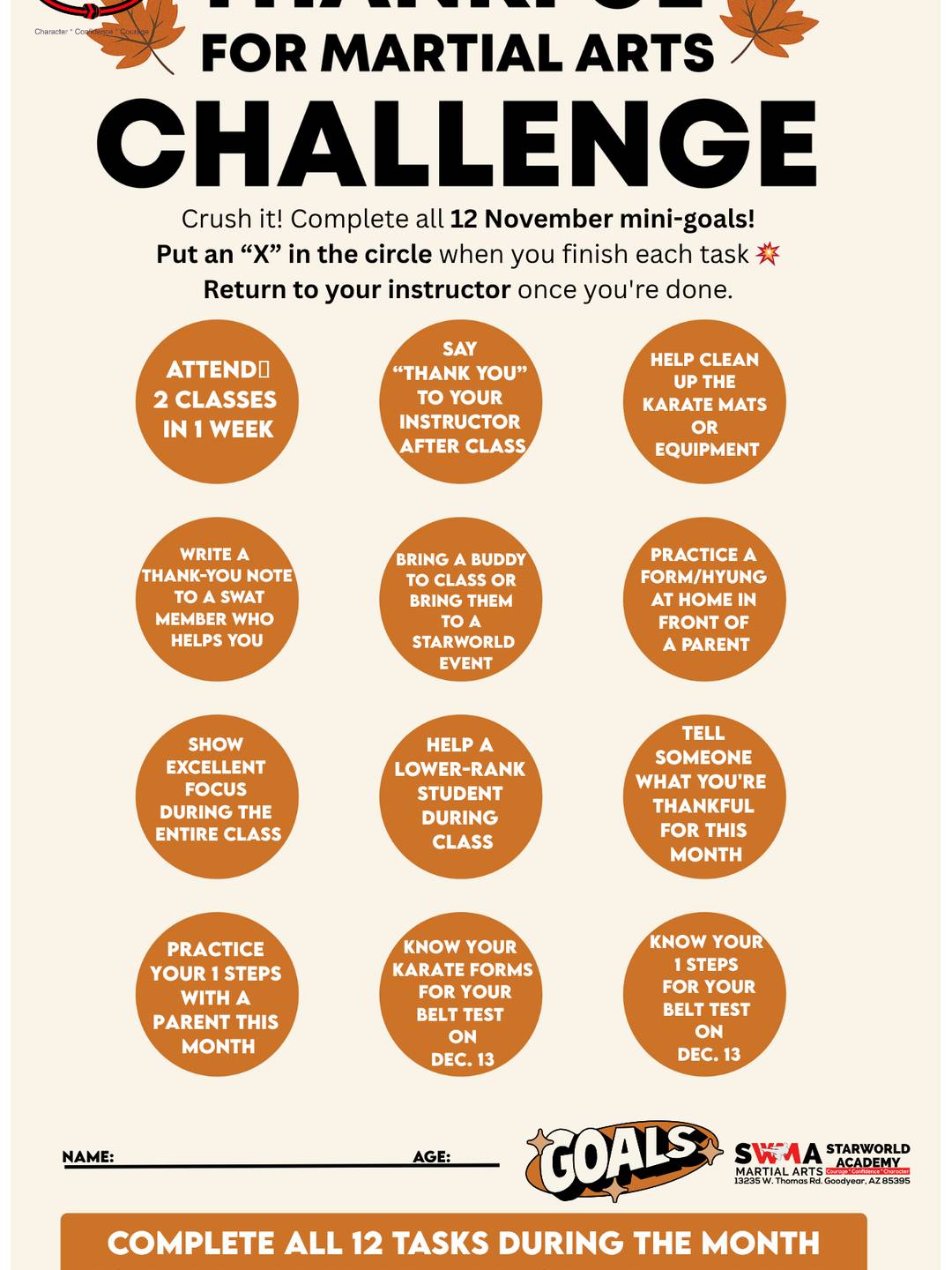 Hi Reader and family, Can you believe it’s already November? The year’s moving fast, and we have a great month ahead at Starworld Martial Arts Academy! Saturday's Weapon of the Month: Nunchuks! Students who attend Gold-level Saturday classes will train with this exciting traditional weapon all month long—great for coordination, focus, and fun! Black Belt Character Words of the Week: Nov 3–9: Respect Nov 10–16: Service Nov 17–23: Gratitude Nov 24–30: Thankfulness & Reflection 🌟 What’s in Store...