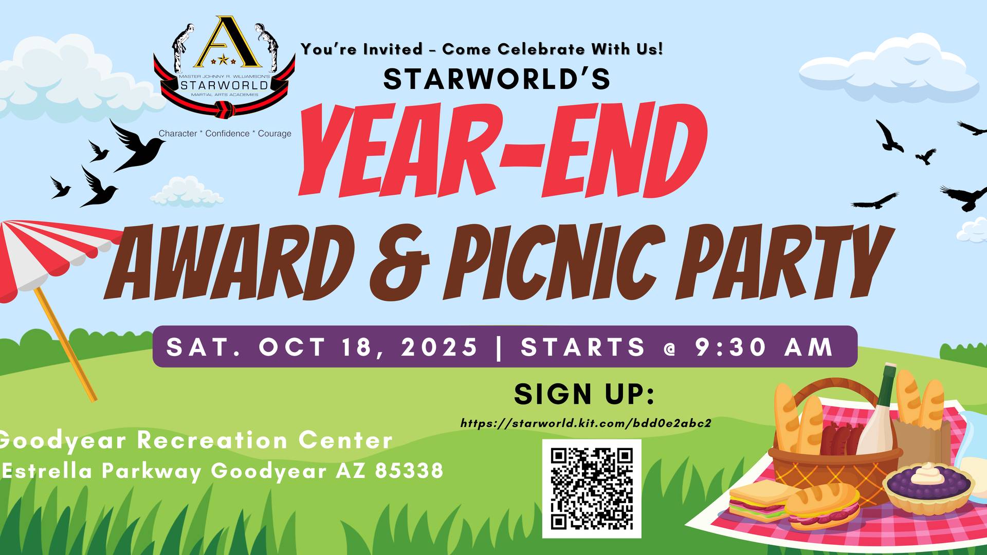 Dear Starworld Families, Today’s Year-End Award & Picnic Party is part of your child’s karate training. Date/Time: Today – Saturday, October 18th, 9:30–11:30 AM Why This Event Matters for Training