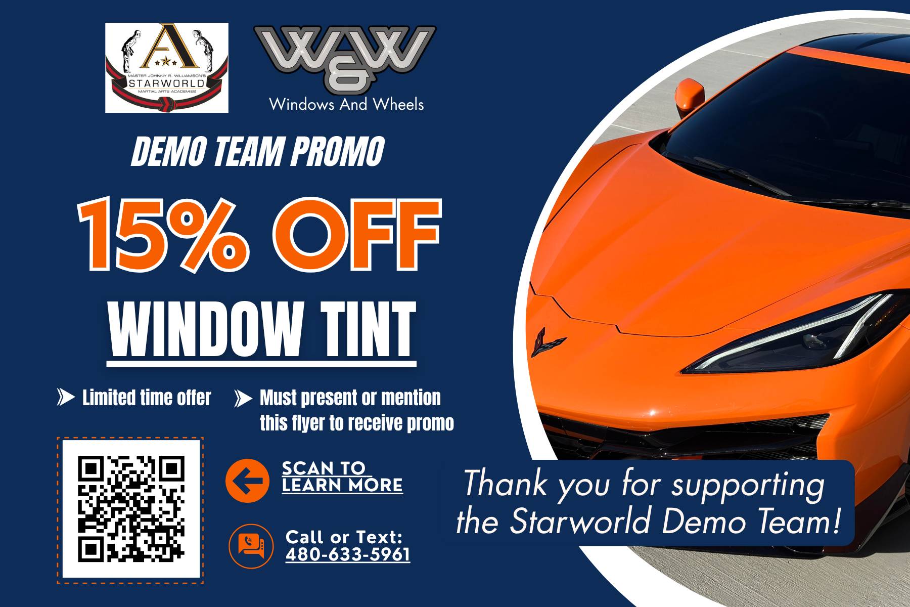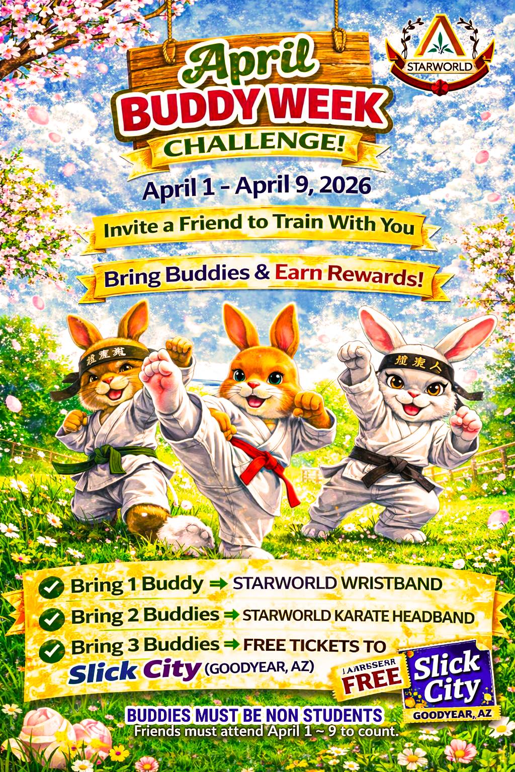 Dear Reader and family, Just a quick reminder—our Demo Team Car Wash Fundraiser is tomorrow, Saturday, March 28th, from about 9:00 AM to 12:00 PM right here at Starworld. Our Demo Team has been putting in extra hours preparing for this season's competition, and this is one way we show up for them. Every car washed helps support their training, travel, and team experience. Even if you can only stop by for a few minutes, it makes a difference. Bonus Opportunity – Save While You SupportWe’ve partnered with a local company supporting our Demo Team by offering This is a great option for families dealing with the Arizona heat, looking to protect their vehicle, or wanting a more comfortable ride. You can scan the QR code on the flyer or call/text them directly. This offer is provided by a local partner. Please contact them directly for details, pricing, and scheduling. 🎉 Next Week: Easter Egg Hunt & GamesApril 1 & April 2 (during all classes) This is one of our most fun events of the year—students won’t want to miss it. Students are welcome to bring a buddy who does not attend Starworld, and if you don’t normally train on those days, you are welcome to attend your rank-and-age class. 👉 Buddies who attend between April 1–9 will count toward April's Buddy Week Challenge. 👏 March Buddy Week – Congratulations!Great job to everyone who participated. 1 Buddy: 2 Buddies: Grand Prize Winners (Buddies Enrolled): Awards will be presented in class next week. Thank you for supporting the March Buddy Week Challenge. 🔥 April Buddy Week – Starts FreshWe are resetting the challenge! April 1–9