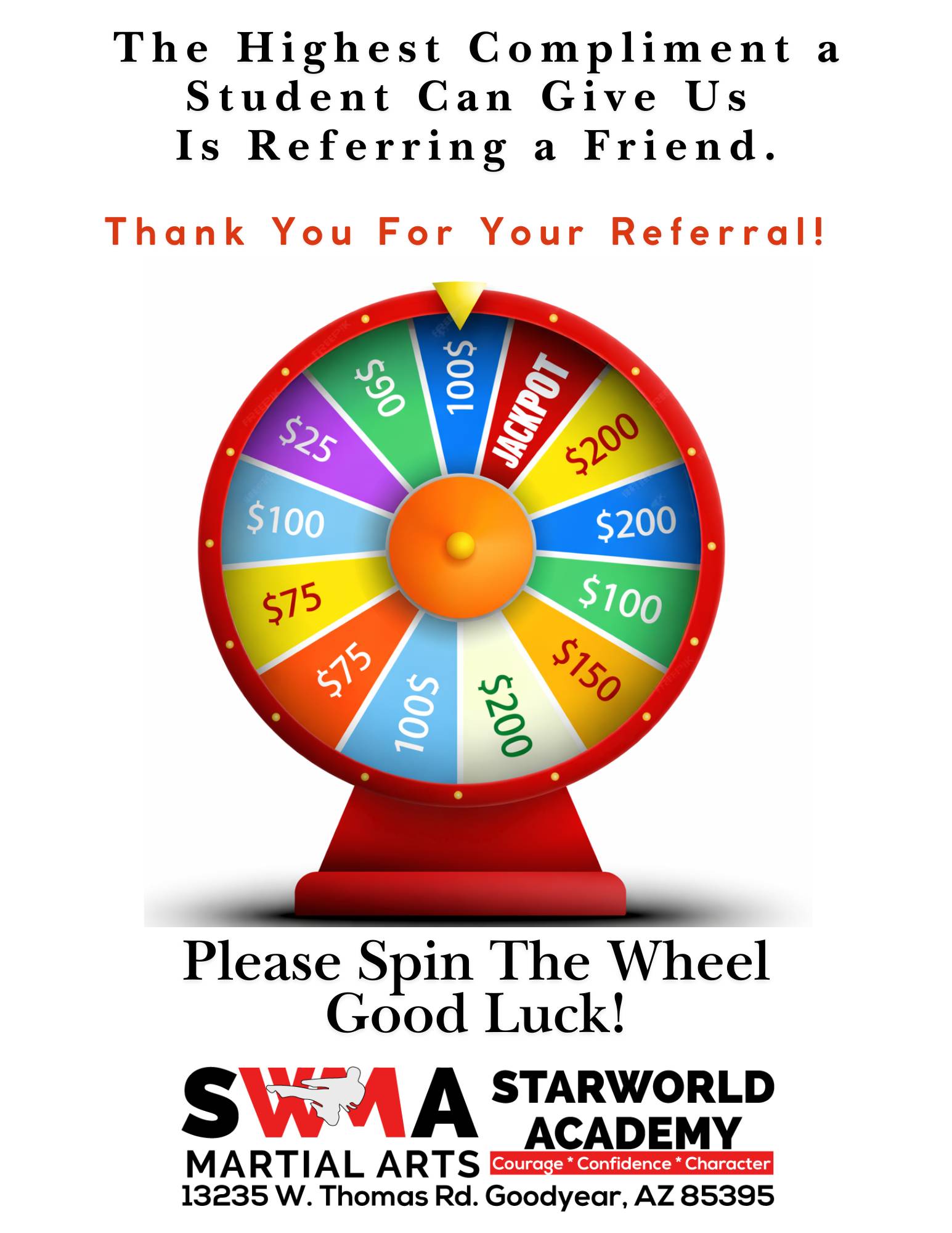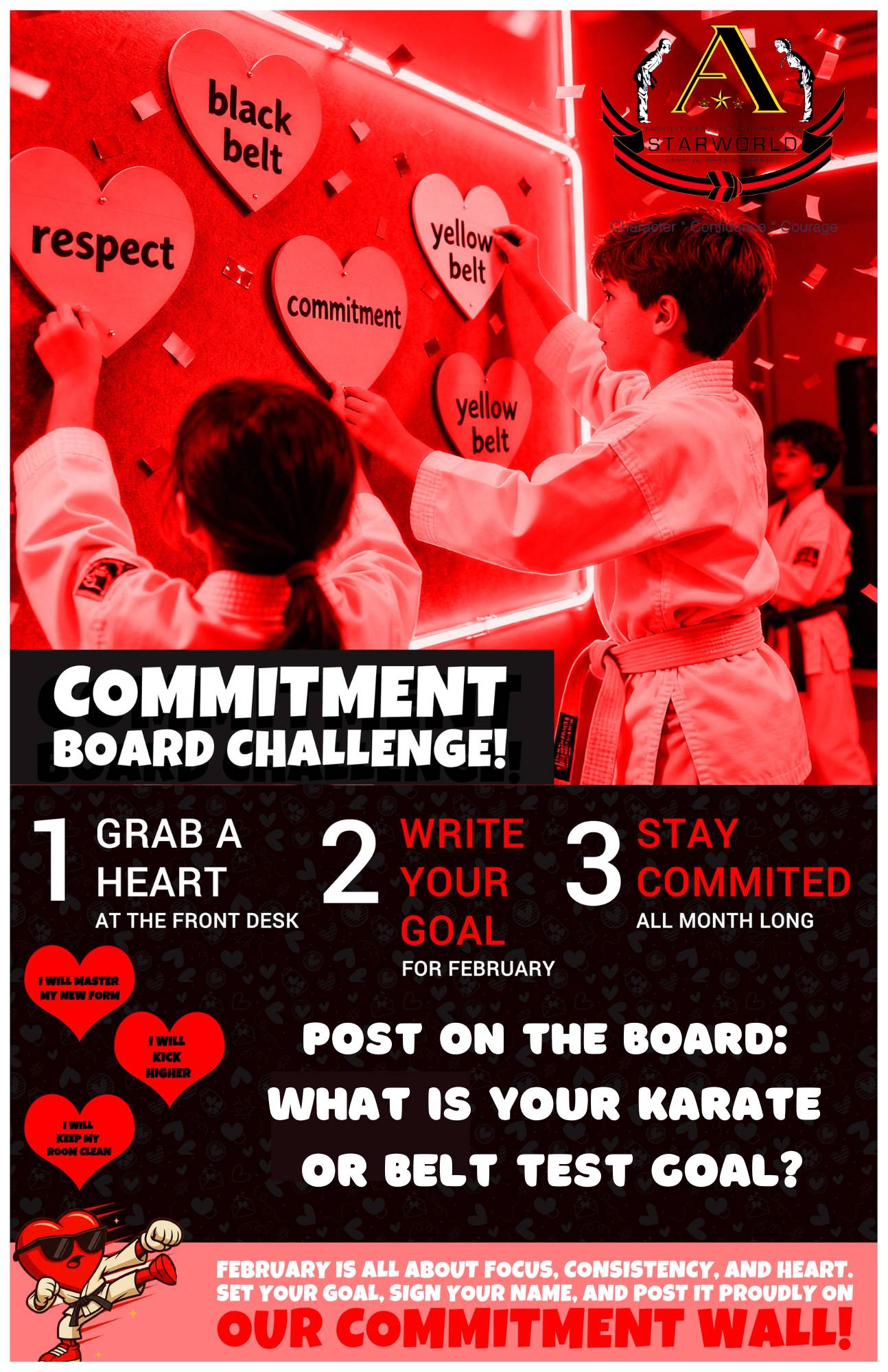 Hello Reader and family, Welcome to February! It’s hard to believe how quickly the year is moving, but we’re excited about what this month has in store for our students and families. February at Starworld is focused on Confidence—the kind that’s earned through preparation, consistency, and effort. Not the loud kind, and not the instant kind, but the kind that’s built over time by showing up, practicing with purpose, and learning how to handle challenges the right way. That’s the confidence that lasts. This month blends focused training with meaningful experiences. Students will continue sharpening their skills as they prepare for upcoming belt testing, participate in special activities, and take part in lessons that reinforce leadership and personal growth. It’s a strong balance of discipline, encouragement, and fun—very much by design. As you know by now, Starworld is about much more than simply being a martial arts academy. We are honored and proud to provide our students with outstanding karate-based physical education, but what we truly pride ourselves on is developing Black Belts as whole people. That means physical skill paired with confidence, respect, leadership, and emotional strength. Throughout February, students will also enjoy short weekly leadership videos featuring some of our very own SWAT Instructors. These students are leading by example, sharing lessons tied directly to confidence and character. And let’s be honest—these Black Belt leadership skills aren’t just for class. Our students use them every day, and they’ll continue to use them for the rest of their lives. As always, it’s truly our honor to have your family as part of the Starworld community. Thank you for the trust you place in us and for helping make our program as strong as it is—and continuing to grow better every month. To make things easy for you, we’ve placed all February schedules, activities, and student materials in two convenient locations on our website: • Event Calendar – featuring February events, school holiday closures, and important future dates, including 2026 Belt Test dates and locations: • Student Downloads – weekly Good Job Sheets, Coloring Sheets, and Mature Student worksheets that support our in-class lessons and monthly theme: We’re grateful for the opportunity to work with your child and your family, and we’re looking forward to a strong, confidence-building February together. Tang Soo! Master Williamson |